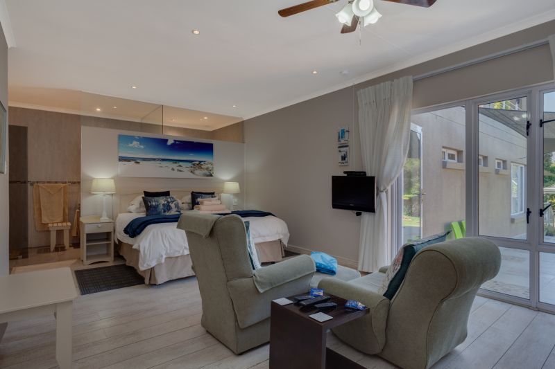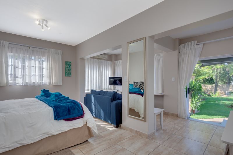 49 on Cherry offers home-from-home accommodation, stylish new suites and beautiful Gardens. En-suite bathrooms with modern shower. Hamiltons soap, shampoo and creme in bathroom. HD flat screen TV, satellite TV with DSTV/ MNET/ Supersport and Netflix. Each suite is air-conditioned & has a kitchenette equipped with fridge, microwave, toaster, kettle, cutlery/ crockery, sink, and all the ingredients for a delicious continental breakfast - cereals & muesli, fresh fruit, yogurt, homemade muffins, bread, butter/ jams/ honey, milk, fruit juice, tea and coffee. Bedside USB plug for charging cell phones. Dressing table and hairdryer. Iron & ironing board. Ceiling fans/ heaters. Airconditioning. Armed response panic button. Phone - free local landline calls. Each suite has its own shaded patio with outdoor furniture, overlooking the pretty garden and pool.