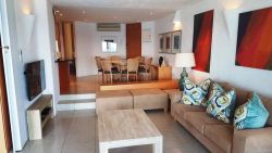 The self-catering apartment consists of an open plan lounge and dining area, with a kitchen. There are three double bedrooms with a main en suite (shower only) and an additional bathroom (bath/shower combo). The apartment comfortably sleeps a maximum of six guests with a King size bed in the main bedroom and twin beds in the second and third bedrooms that can be converted to King Size beds on request. Quality linen, bath and beach towels are provided.