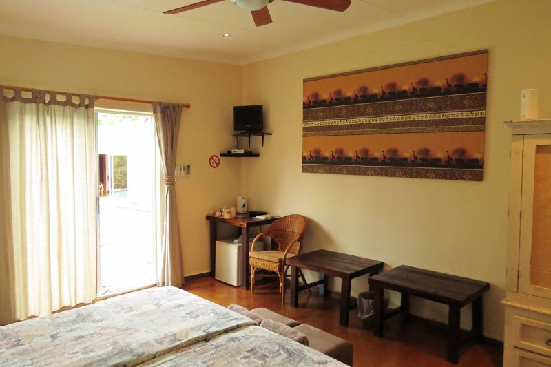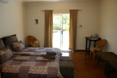 2 Garden Cottages for 2 persons each, with 2 single beds and an en-suite bathroom (shower, sink and toilet), aircon and ceiling fan. Free WiFi is available. Both units have tea and coffee making trays, a bar fridge and DSTV.