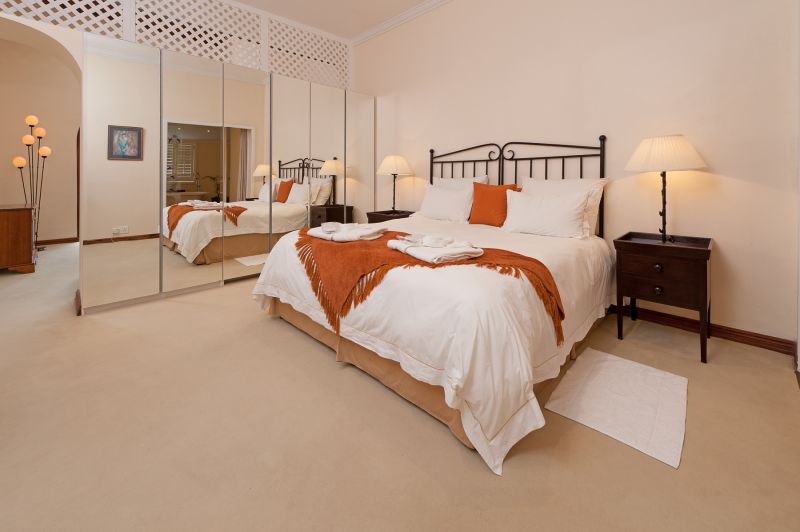 Large room with a king size bed, Satellite TV, coffee and tea facilities, overlooking swimming pool, view towards Walker Bay. Communicating door with another, smaller bedroom with two single beds. Bathroom with shower, bidet, WC, double-basin, to be shared. Rates are for 2 adults sharing; extra charge for max. 2 add. adults = R700/p.p. and for children 3-13 years old = R500/p.kid (low season); below 3 years = free. One cot is available. This room is not equipped for s/c.