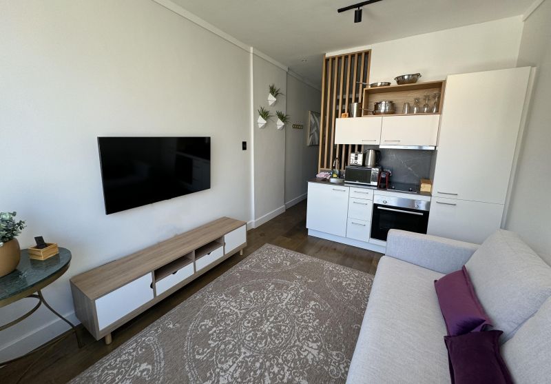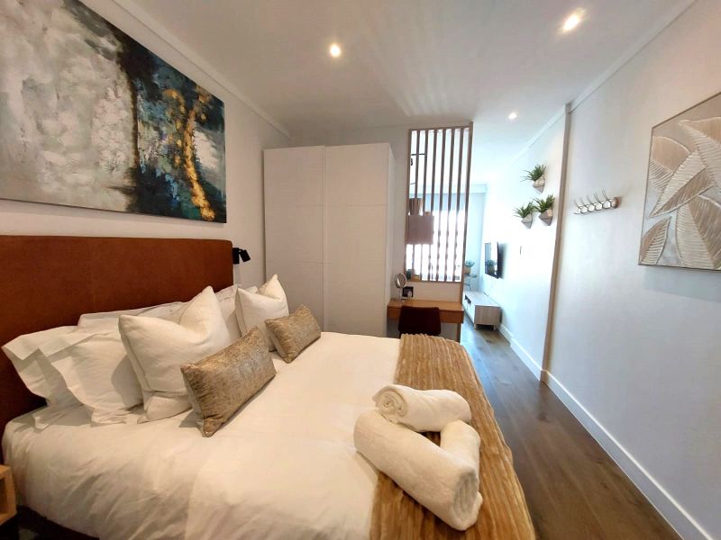 Welcome to our stylish studio en-suite apartment in the heart of Cape Town! Our fully equipped kitchenette, combined with daily housekeeping (on request), ensures a seamless stay. This apartment's standout feature is the communal pool with a view.