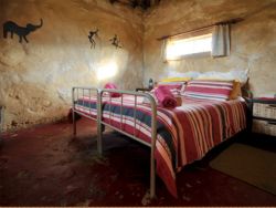 The Serval Room has an outside entrance with a beautifully decorated carved rhino door. The large ceiling-to-floor windows gives a view into a private African rock-art garden. It has a king-size double bed as well as a sleeper couch for a child and an en-suite toilet and shower. Extra rate for third person of R495 per night. B&B rates.