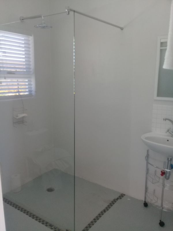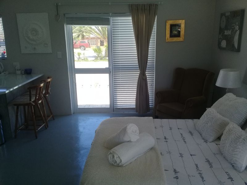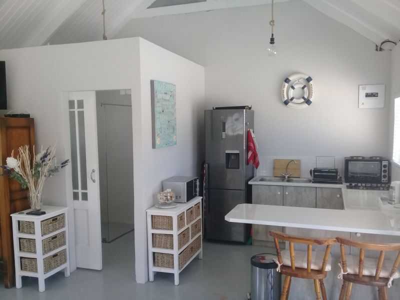 The studio has an open-plan layout and can accommodate up to 2 guests. The bedroom area contains a queen-size bed. The bathroom contains a shower, a toilet, and a washbasin. The kitchen is well-equipped with a 2-plate mini-stove and oven, a hob, a fridge-freezer, microwave, kettle, toaster, and a breakfast bar with stools. There is also 4-seater dining table and chairs. A TV is included. There is a patio at the front and the back of the studio. Braai facilities are available.