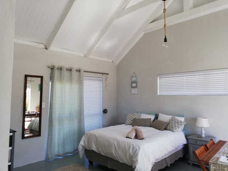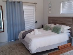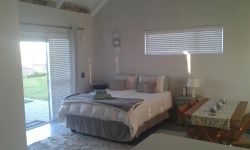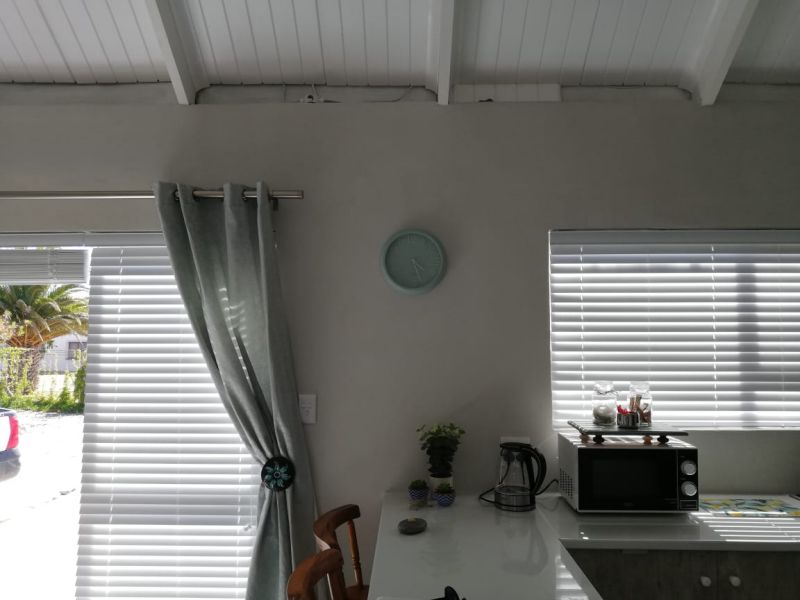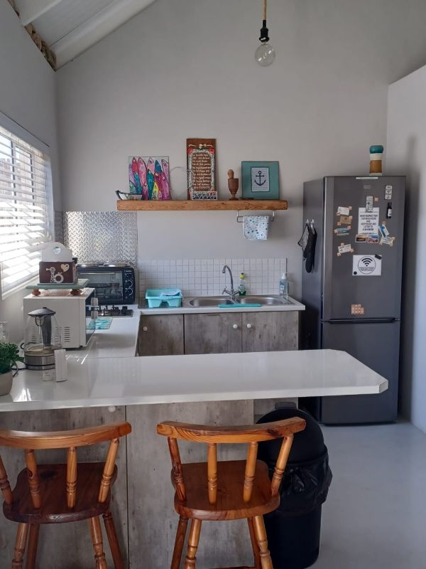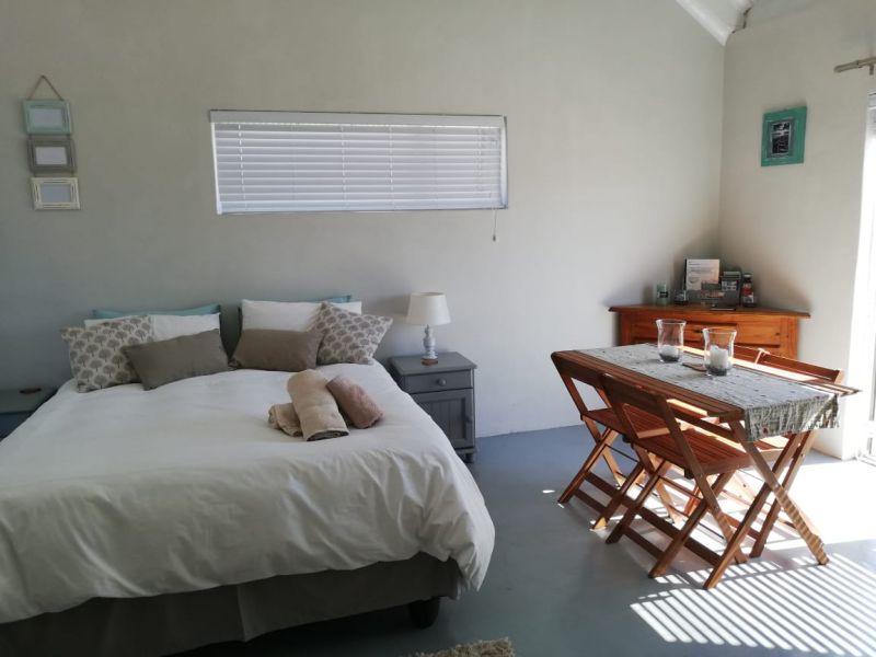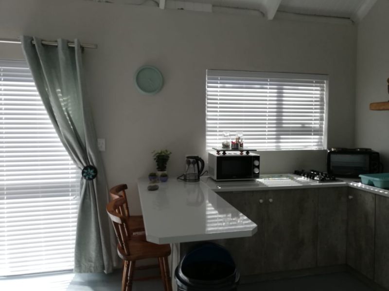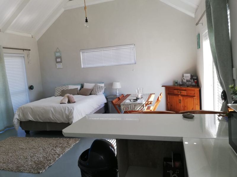 The studio has an open-plan layout and can accommodate up to 2 guests. The bedroom area contains a queen-size bed. The bathroom contains a shower, a toilet, and a washbasin. The kitchen is well-equipped with a 2-plate mini-stove and oven, a hob, a fridge-freezer, microwave, kettle, toaster, and a breakfast bar with stools. There is also 4-seater dining table and chairs. A TV is included. There is a patio at the front and the back of the studio. Braai facilities are available.