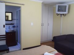 Situated upstairs and has a beautiful view of Table Mountain. En-suite bathroom with shower LCD TV with Netflix Free WiFi (fibre) Fully equipped Kitchenette with large fridge with freezer, 2 plate gas stove, microwave, kettle etc. You will have a secure parking bay behind a motorised gate. We will not enter your unit for servicing (kindly service your own unit, once a week we will still provide you with clean linen.)
