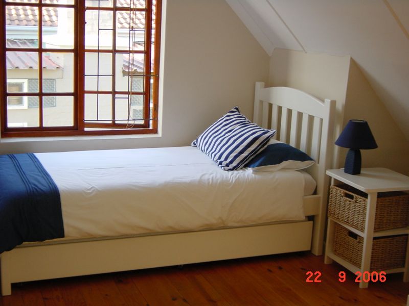 It has an open plan format downstairs, with a kitchen at one end of the living area, a ten-seater dining room table and at the other end a comfortable lounge. The kitchen opens onto a small private back garden with views of the nearby mountains and a covered veranda area with built in “braai,” which is the local term for what is better known as a barbeque internationally.