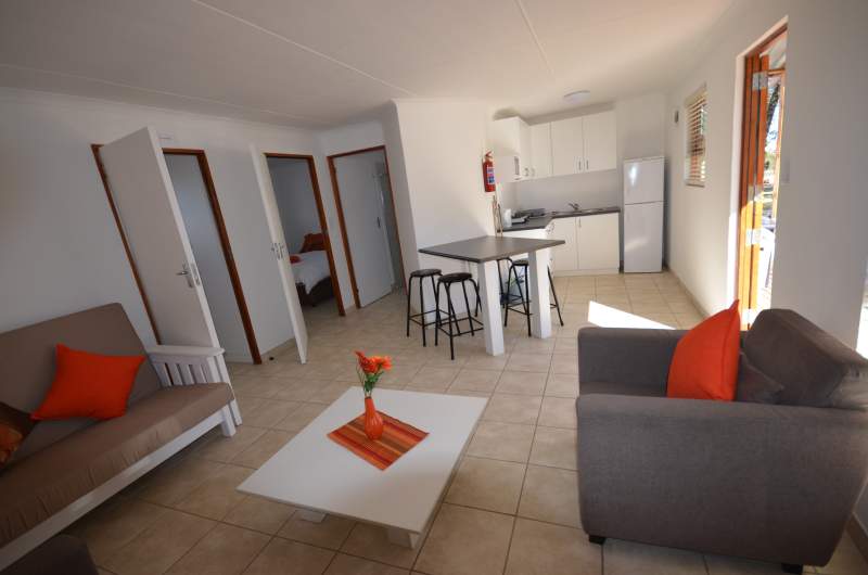 Consists of 1 room with a double bed, 1 room with 2 single beds and a double sleeper couch in the lounge. Bedding and towels included, equipped kitchen with fridge, stove plate, microwave etc, and own shower with toilet. Own deck with private braai. Braai grids available at reception at R100 deposit.