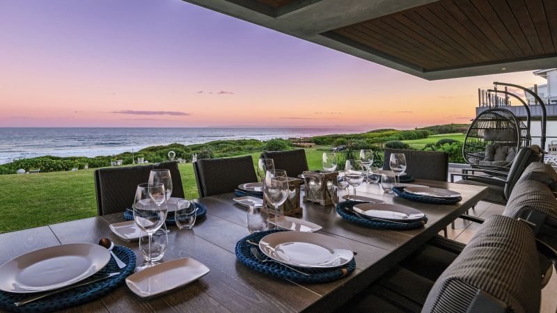 The main lounge and dining room are both open-plan with the mod con kitchen. Large glass stack sliding doors allow for the indoors to flow outdoors, onto a spacious sea-facing porch with an outdoor dining table and additional seating arrangements. This is an ideal vantage point from which to take in the sprawling sea views for relaxation, sundowners and al fresco dining. On the opposite side of the living area is an undercover BBQ/Braai patio with ample outdoor seating arrangements.