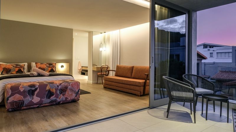 Room 4: At the end of the hallway. King-size bed. Single couch. Sliding doors open onto a balcony with seating arrangements. Partial sea views. Built-in cupboards. Dressing table. En-suite bathroom with shower heated towel rail and air conditioner.
