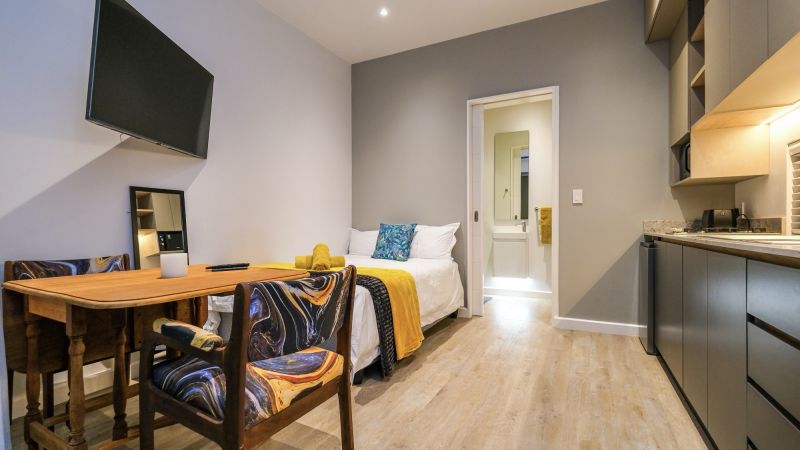 Room 5: Discrete, at the back of the property. Private entrance. Queen-size bed. 2-seater dining table. Wall-mounted smart TV with own Dstv. Sliding doors open onto a small patio with seating arrangements. Garden views. Kitchenette with stove top, microwave, bar fridge, toaster and kettle. Built-in cupboards. En-suite bathroom with shower.