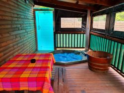 Come and enjoy the beautiful views and sounds of nature. Our Kol-Kol Wood-Fired Hot Tubs makes the sunsets much more mesmerizing whilst you enjoy your sundowners. Our showers are situated on the deck, but our outside blinds can close to give you your privacy. Parking in available on the premises.