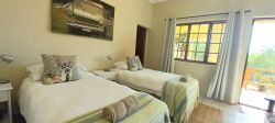 This bright and beautiful room is a personal favourite with windows on all sides offering views of all of the surrounds. It's decorated in bright Mozambican greens and offers twin or a king size bed as well as a brand new en suite bathroom with shower, loo and washbasin. It has its own bodum coffee and tea station with 180 degree views of the mountains and Towerkop beyond. It has its own entrance that leads from the extended veranda.
