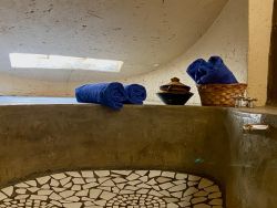 Our stunning honeymoon/family cottage, ‘UMNDENI’, has two double beds in an open plan setting. Private bathroom with shower and enormous bath with mosaic inlay.