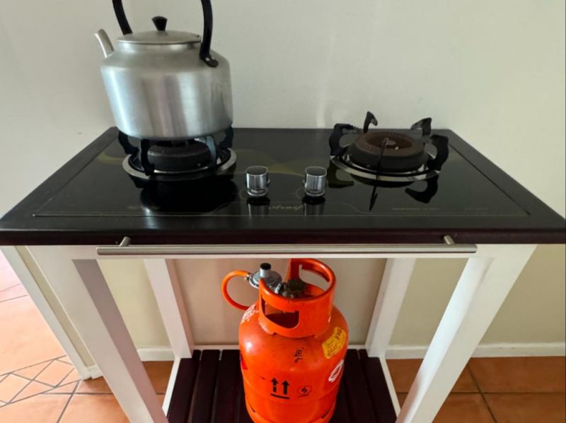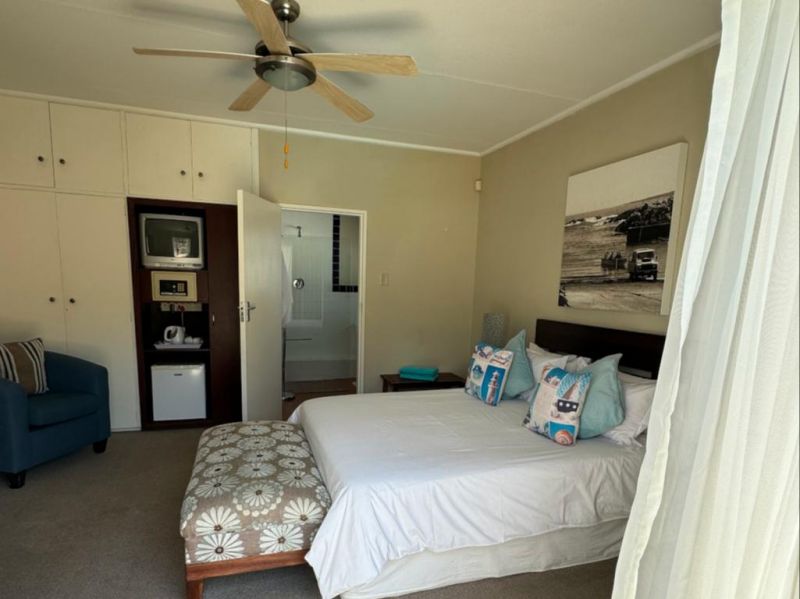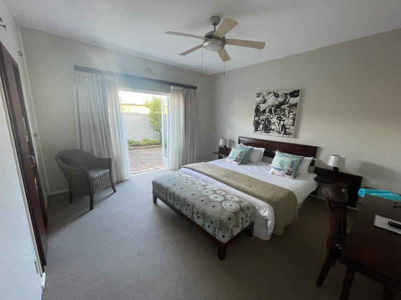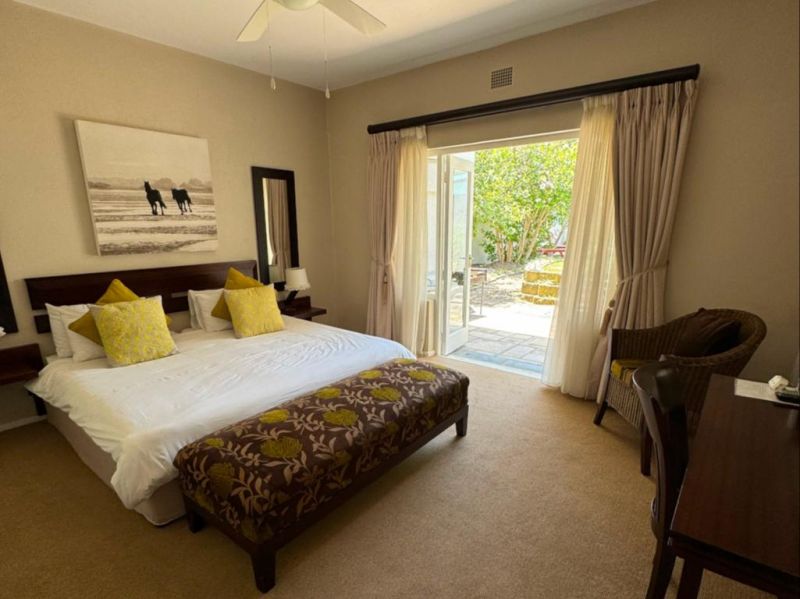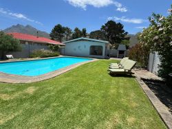 The open-plan lounge includes a dining area and a TV with DStv. Wi-Fi access is available. Guests can enjoy outdoor braai facilities, a large pool, and recliner chairs. Off-street parking is provided. Pets and smoking are not allowed. The guesthouse owners reside on the top level but respect guests' privacy. Guests have their own entrance and full use of the facilities.