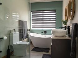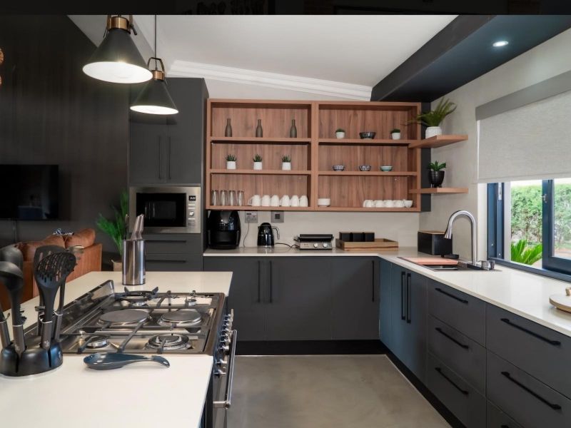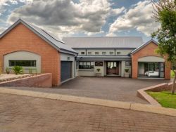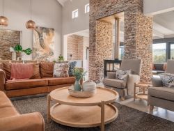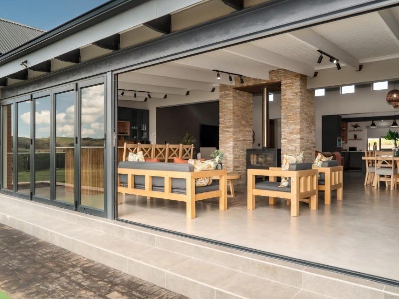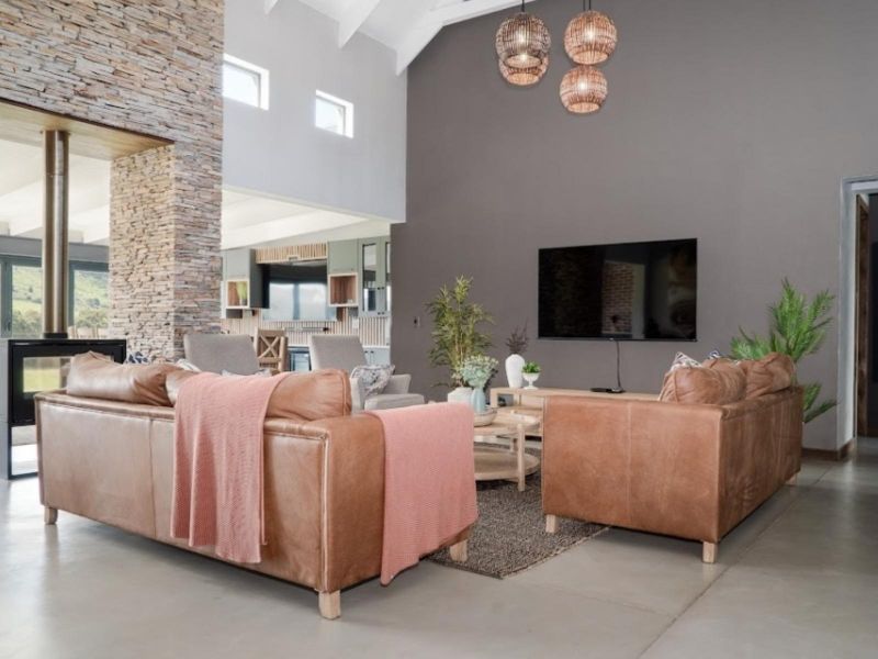 Mountain View @ 780 is a beautifully appointed self-catering holiday home located in the Highland Gate Golf and Trout Estate in Dullstroom, Mpumalanga. This property is a perfect choice for friends and family who are looking for a peaceful and relaxing home to enjoy their stay in the Highlands Meander region. The home can accommodate up to 8 guests in 4 bedrooms with en-suite bathrooms and a guest bathroom. All of the rooms are equipped with extra-length single beds, which can be converted into a king-sized bed. Two en-suite bathrooms feature a bath and a shower, while the other two are fitted with a shower. The rooms are equipped with tea- and coffee-making facilities. Linen and towels are provided. The spacious open-plan living area features a kitchen, dining room, and a bar and braai room. The kitchen is fully equipped with a fridge-freezer, gas stove, oven, microwave, air fryer, cutlery, crockery and tea- and coffee-making facilities. The living room is furnished with comfortable couches, a large TV and a dining table. There is also an indoor fireplace that warms up the living room and the braai room. The braai room is furnished with seating, an indoor built-in braai and a bar that is equipped with a bar fridge as well as an ice machine. An entertainment system includes a TV with surround sound for viewing pleasure and a bar with stools. The room has glass doors that open onto the outside that lead onto a putting green that guests have access to. Access to Wi-Fi is available. The scullery is equipped with various amenities such as a dishwasher machine, washing machine and a tumble dryer for the convenience of guests. For free and secured parking, the villa comes with a double garage for parking for up to two cars. There are solar power facilities at the villa for backup power in the event of an outage or load shedding. Guests have access to lovely mountain views and secure off-street parking on the premises and to the golf course. This property is within proximity to activities like fly-fishing and various amenities like local shops, restaurants and estates like Dunkeld Country and Equestrian Estate.