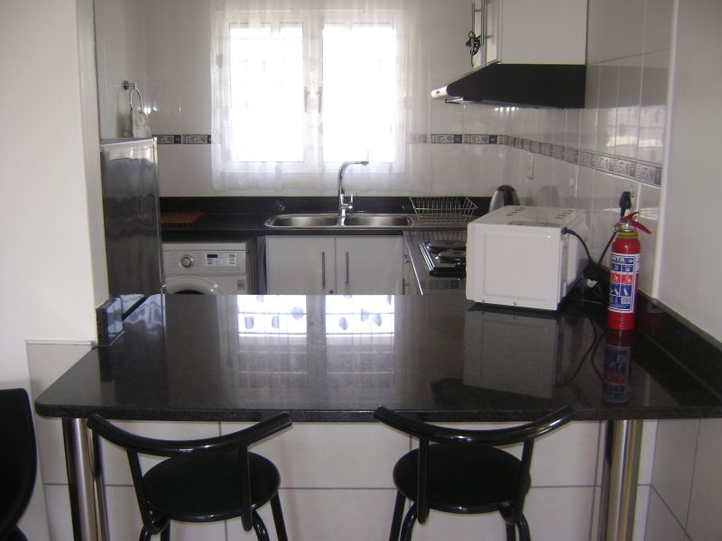 The kitchen is well-equipped kitchen contains a fridge-freezer, a microwave, a stove with an oven, as well as built-in cupboards to store crockery and cutlery.