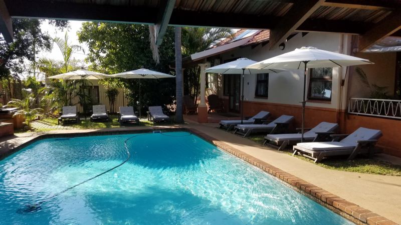 We have a beautiful lapa with a braai (BBQ), bar, a sparkling swimming pool and a putting green. A small but fine dining dinner menu is on offer. The property is fully secured with electric fencing and ample parking inside.
