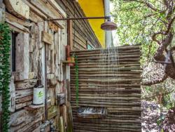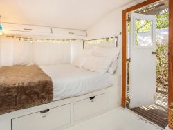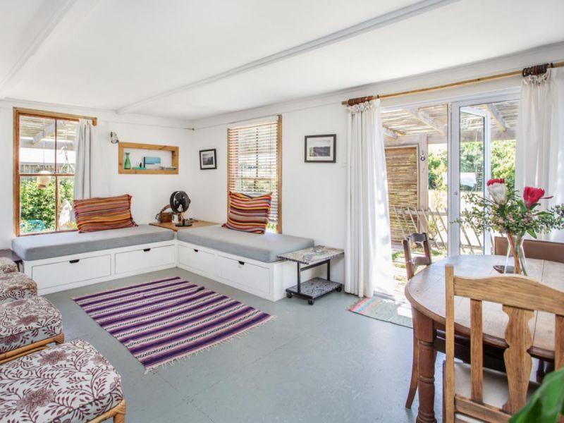 Scarborough Beach Bungalow is set on a large corner plot with great mountain views and a northern aspect. It is nestled in a spacious garden only a 2-minute walk from the spectacular Scarborough Main Beach. It boasts 2 entire homes: the charming Family Bungalow and the quirky Guest Bungalow designed to charm. Both accommodations enjoy their private entrance, private outside deck/patio, and social braai/BBQ area. Guests are in for an experience they will not forget. Guests are welcome to book the Family Bungalow and the Guest Bungalow together for larger groups. Additional sofa beds are available on request for a cost of per night. The Family Bungalow sleeps up to 7 guests; however, it is recommended for 6 guests and limited to 4 adults as the 3rd bedroom is an adjoining bunkroom including a sofa bed, available on request for a cost per night. It comprises an open-plan living room & eat-in kitchen with concertina doors onto the spacious sun-drenched deck. The main bedroom has a 4-poster bed with a family bathroom across the passage. The 2nd bedroom and bunk room are adjoined, so the house is perfect for 2 couples with children or 1 couple with older and younger kids. The 2nd bedroom has a double bed, and the bunk room has 2 single bunk beds and a single bed. The family bathroom has a big steel bath and an outside shower under the trees. The Guest Bungalow, located next to the Family Bungalow, sleeps up to 4 guests; however, it is recommended for 2 adults with additional sofa beds in the common lounge area, available on request for a cost per night. It comprises a 40 m² open plan living space with large sash windows and two comfortable sofa beds. The kitchen is well equipped and open plan with a central island for cooking and eating. There is a covered outside private braai area off the kitchen. The bedroom is ensuite with a built-in queen bed with drawers and hanging space. There is a Victorian slipper bath, with a handbasin and toilet. Outside is a sheltered deck with a secluded outside shower. The bedroom and bathroom are contained in a beautifully converted aluminium caravan. The caravan has been expertly fitted to float off the wall of the studio space with direct access from the living room through a sliding door.