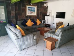The main unit sleeps up to six people in three bedrooms. Two rooms have double beds and the third one has two single beds. The main bedroom has an en-suite bathroom with a large shower. There is another bathroom with a bath.