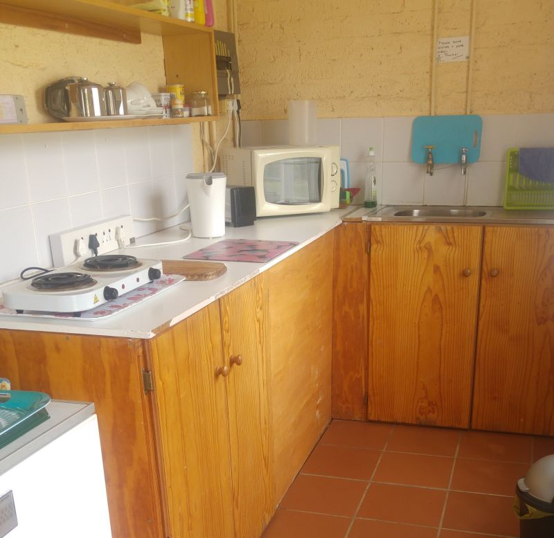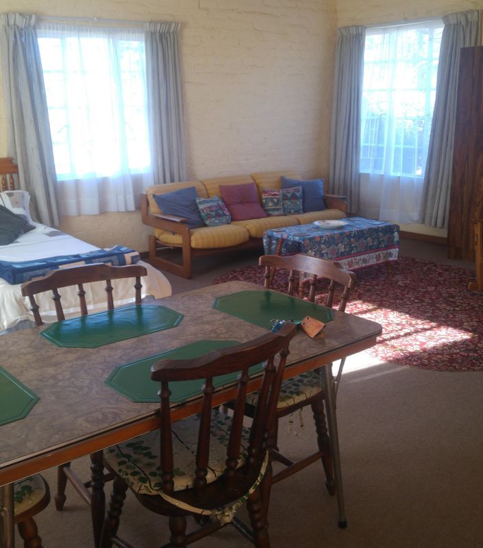 The Cottage has 1 bedroom and 2 stack beds in the large living area. No TV. There is a small kitchen & a bathroom with a shower.