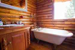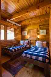 The chalet comprises 2 bedrooms and 2 bathrooms, as well as an outdoor shower. The main bedroom is located in the loft area and is furnished with a queen-size bed. The room has an en-suite bathroom with a shower. The second bedroom is furnished with 2 single beds, and is located on the ground floor. A three-quarter bed is available in a sleeping alcove above the living area for a fifth person. Situated on the ground floor, the second bathroom is equipped with a free-standing bath and a toilet.