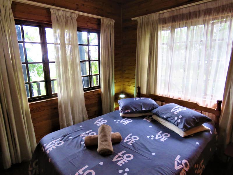 Each log home has open plan kitchen/lounge with sliding glass doors opening onto wood deck, overlooking the garden and with outside barbeque / braai facilities. is fully equipped with stove/oven, fridge/freezer, micro-oven. The lounge with lounge suite , sleeping couch TV with DSTV