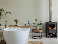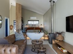 STUDIO The studio apartment is a perfectly private, open-plan Retreat designed for two adults, complete with its own separate entrance. This cosy space combines the kitchen, bedroom, and lounge into one relaxed area, featuring a comfortable queen-sized bed. For added luxury, the space includes a deep bath and a freestanding fireplace, complemented by a separate private bathroom housing a shower, toilet, basin, and hairdryer. Guests can fully relax on the private balcony, which features its own sizeable hot tub, and the entire studio is kept comfortable with full air-conditioning.