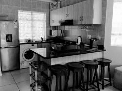 The kitchen is equipped with a fridge, oven and stove, microwave, washing machine, and utensils /equipment to make your holiday so much easier, - includes a coffee plunger, slow cooker, airfryer, nespresso coffee maker, bread/meat slicer, as well as a conventional toaster and sandwich griller/toaster for those midnight toasted sarmies. The Kitchen features a breakfast bar, seating 4 persons, and a compact 4 seater dining table and chairs is also available .