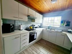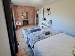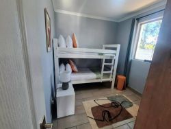 Furnished for 4, the 2 rooms have king-size and bunk beds, sharing a shower-only bathroom. The open-plan kitchen has a washing machine, stove and dining area. Wi-Fi and a TV with streaming services are available. The unit has a portable braai.