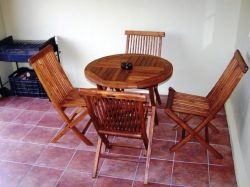 One-roomed self-catering apartment with twin single beds or made-up as a kingsize bed (on request). Bathroom with shower. Kitchenette with gas hob & fridge-freezer. Solar electricity for lights & fridge-freezer & charging of small appliances. Gas geyser.