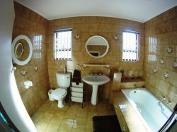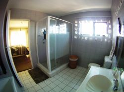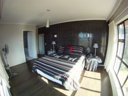 House details :- - 4 bedrooms + study (or bedroom ) . Main bedroom en suite . - 3 bathrooms , full . - Lounge - Dining room - Family room - Breakfast / sun room - Fully fitted kitchen - Roof entertainment area / sun deck - Braai facilities . - Security - Double garage - Sea & mountain views . - House 742 m2 , stand 1200m2