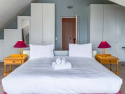 Reached by beautiful spiral staircase. Huge main bedroom with queen size bed, stunning bay view, Hout Bay harbour, Chapman’s Peak Drive and Kommetjie lighthouse in the distance.