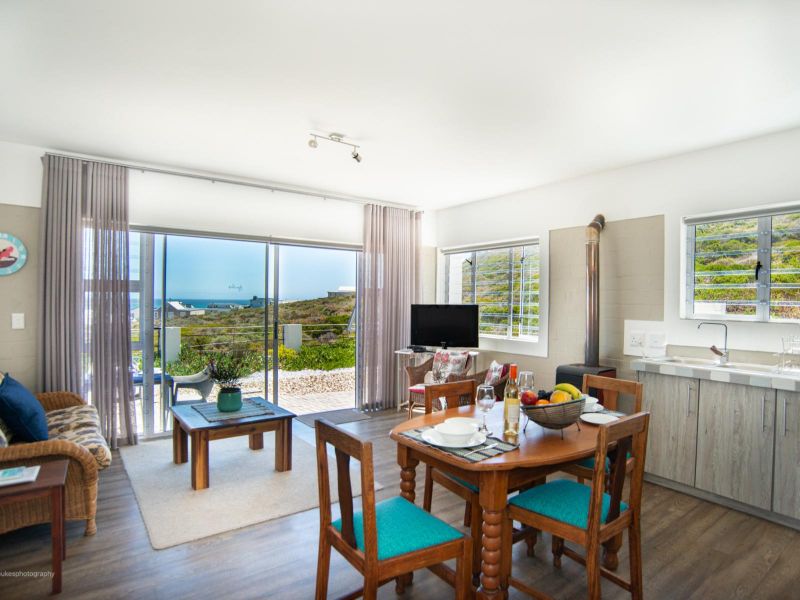 The FYNBOS LUXURY unit is well equipped with all the necessary utilities you will need to enjoy a comfortable self-catering stay. It consists of a fully equipped kitchen with stove and oven, a dining room table seating 4 people and a small sitting area with a fireplace. The bedroom has a Queen Bed and a single sleeper couch ideal for a small child. The en-suite bathroom has a bath and shower. There is an outside braai facing the green Fynbos area, exclusively for the use of Fynbos guests. Booking the adjacent Seashells apartment as well and opening the interleading door between the two apartments, makes it ideal for a family of 4 or or 5 people.