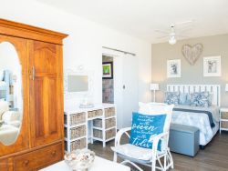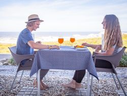 SEASHELLS is a very spacious open-plan, luxury suite facing the ocean and has two single beds that can be converted into a super king-size bed. It has a spacious seating area and a private bathroom with a shower. It is equipped with its own kettle, crockery and cutlery, toaster microwave, small fridge and a patio with a table and chairs. A portable braai can be supplied upon request. Please note, it does not have a kitchen basin to do dishes. OCEAN is a luxury suite facing the ocean and a view on the Green Fynbos area. It has a separate bedroom with a Queen Bed and a Double Bunk bed for two children. It has another daybed in the adjacent living area. The living area has ample seating and a table and chairs. It also has a full kitchen equipped with a gas stove, fridge, kettle, electric frying pan, toaster, egg boiler, crockery and cutlery. It has one bathroom with a shower. You also have your own patio with a table and chairs. A portable braai is supplied.