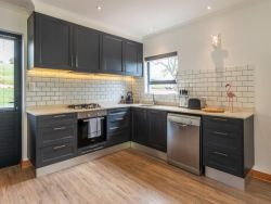 This cottage features a fully-equipped kitchen with large fridge, dishwasher, and oven. The extra long bed can be set up as one king size or two singles.