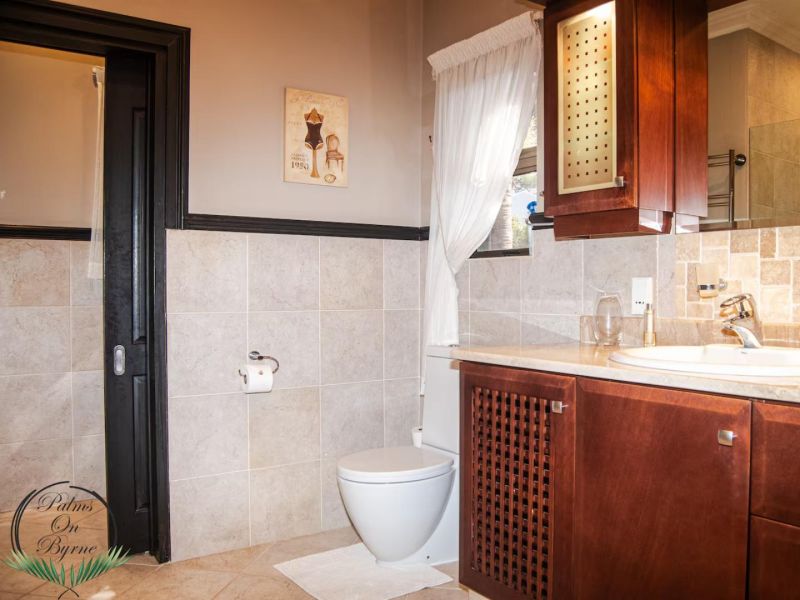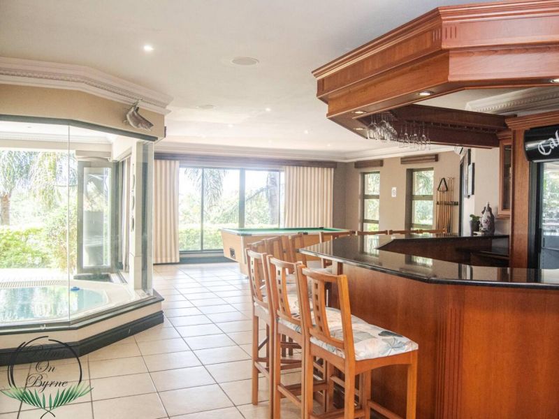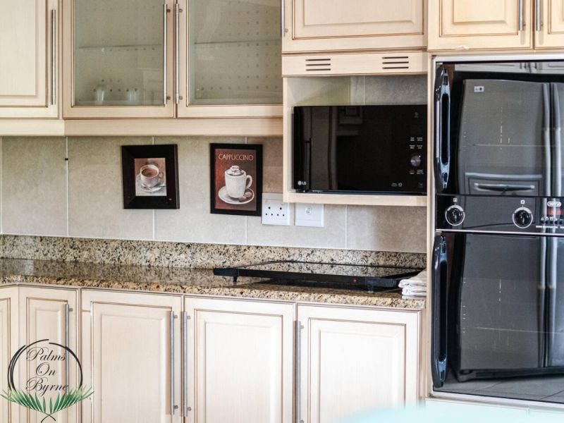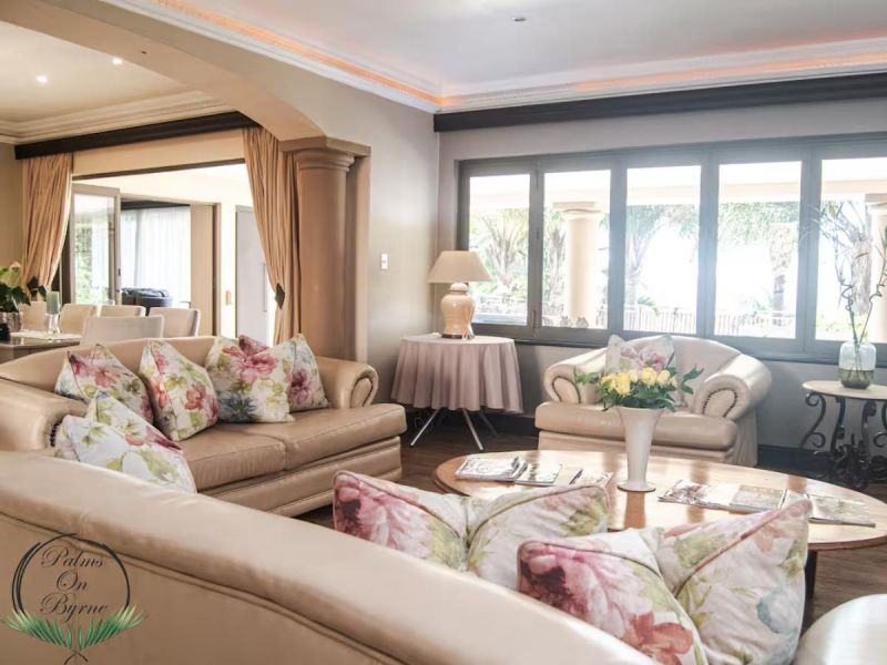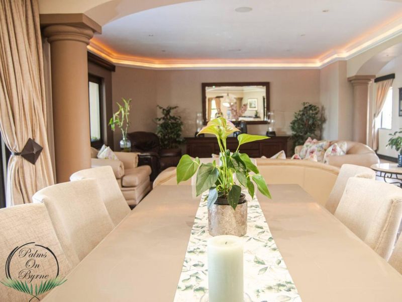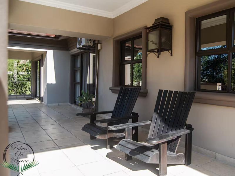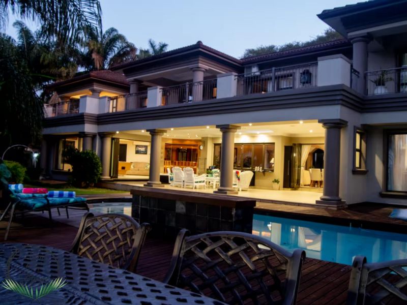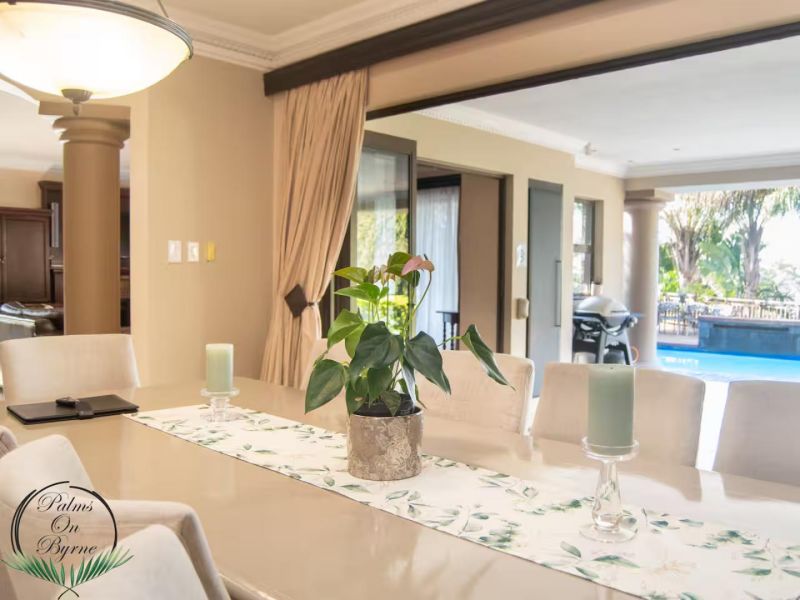 Palm on Byrne is an upscale self-catering residence situated in Durban, offering a lavish stay for groups. This spacious home features five bedrooms and can comfortably host up to ten adults, two children, and one baby. The accommodation includes a main bedroom with a king-size bed and an en-suite bathroom featuring a spa bath and shower, while the remaining four bedrooms each have a queen-size bed and a full en-suite bathroom. For families, a cot is provided, and one room includes a sleeper couch for children. Linen and towels are supplied. The kitchen is fully appointed with a fridge-freezer, stove, oven, microwave, and all essential crockery. A separate scullery offers a dishwasher, washing machine, and tumble dryer for added convenience. The house provides both a spacious dining area and a comfortable living room with a TV. Complimentary Wi-Fi is available throughout the property. For leisure and entertainment, the house boasts an indoor area with a bar and a pool table. This opens to a large patio featuring ample seating, braai facilities, and a relaxing jacuzzi. The patio leads directly out to a sparkling swimming pool, creating the perfect outdoor space for enjoyment. The residence is also conveniently located near major attractions like the Sunningdale Centre, La Lucia Mall, and Gateway.