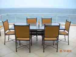 The modern five sleeper apartment is well furnished, with 3 bedrooms and 2 bathrooms. The main bedroom is en-suite, while the twin and single room share a second bathroom that offers guests both a bath and a shower. Two air conditioned bedrooms and the lounge area have sliding doors opening onto a stunning sea facing patio where one can watch the waves crashing onto the rocks below. All rooms have ceiling fans to accommodate the hot summer days. A modern open plan kitchen with granite counter tops is fitted with a microwave, fridge/freezer, dishwasher, washing machine and tumble dryer. The lounge, equipped with DSTV, flat screen TV, DVD player and a Hi-Fi system, opens onto a magnificent patio that runs the full length of the apartment. It is furnished with loungers, an 8 seater dining table and a gas braai.