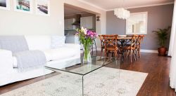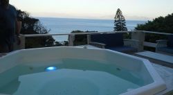 This comprises a full kitchen with scullery/laundry, the kitchen leads into a dining room /lounge (open plan). This area has 2 x 3m stacking doors which give the most stunning view. They lead out onto the jacuzzi deck and two beautiful bedrooms.