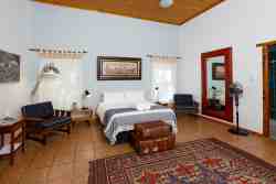 6 On Burger Street is a guest room located in the host’s property, situated in the hamlet of De Rust. The guest room offers a comfortable overnight stop for guests to rest. This spacious, light and airy room can accommodate 1 or 2 persons and has a private entrance accessed from a large patio. The room is furnished with a double bed and a seating area, and features an en-suite bathroom fitted with a bath and a separate shower, a basin, and a toilet. In addition, the room contains free Wi-Fi access and tea- and coffee-making facilities.