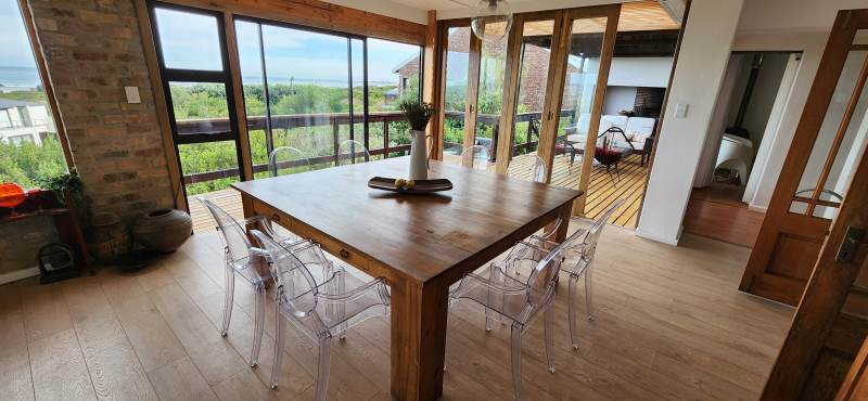 The home also has an indoor braai in the lounge space. This area opens onto a lovely wooden deck with outdoor furniture and braai facilities which is the perfect spot for a Sundowner while admiring the views and the seasonal whale watching. Guests are afforded secure parking on the property.