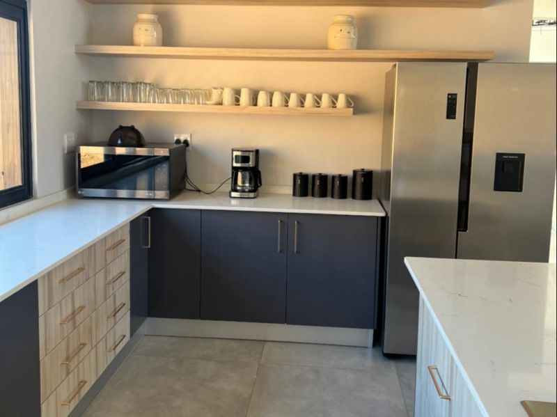 The fully equipped kitchen includes modern appliances, such as a dishwasher, oven, microwave, toaster, and washing machine, perfect for preparing gourmet meals. The outdoor dining area on the private patio offers stunning views of the surrounding landscape.