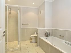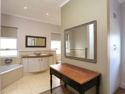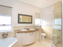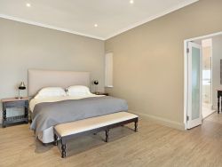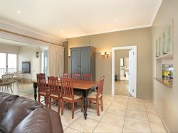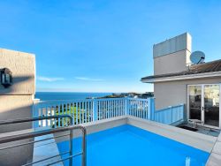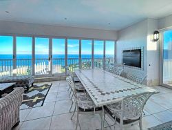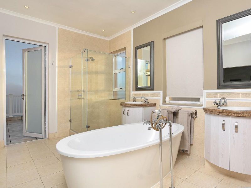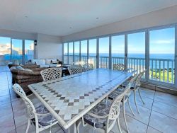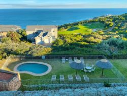 Situated within the prestigious Pinnacle Point Golf Estate just 550 meters from the Garden Route Casino and 6.5 km from the centre of Mossel Bay, Pinnacle Point Heritage Villa is a luxurious double-storey villa offering breathtaking views of the Indian Ocean. Perfectly situated along the world-famous Garden Route, this stylish Retreat is ideal for families or groups of friends seeking a coastal getaway with easy access to local attractions and outdoor adventures. This elegant penthouse-style villa sleeps up to 8 guests and features 4 beautifully appointed bedrooms, each with its own en-suite bathroom. Two of the bedrooms are furnished with plush king-size beds, while the other two include twin beds, making it perfect for both couples and children. Each en-suite bathroom includes a bathtub, shower, basin, and toilet, with an additional fifth bathroom featuring a shower for added convenience. All bedrooms open onto private balconies with panoramic ocean views. The open-plan living space is bathed in natural light and offers a fully equipped modern kitchen with an oven, stove, fridge-freezer, microwave, cutlery and crockery. A dishwasher and washing machine are also provided for guest convenience. The lounge includes a stylish dining area and a comfortable sitting space with a flat-screen TV and full DStv access, as well as complimentary Wi-Fi. Stacking glass doors open up to an enclosed entertainment patio, complete with outdoor furniture, an extra dining table, and a built-in braai, perfect for alfresco dining while enjoying the ocean breeze. Step outside to a generous balcony featuring a private splash pool, ideal for soaking up the sun or stargazing after dark. For golfers, the prestigious Pinnacle Point 18-hole golf course, SA's 3rd-ranked, is easily accessible from the villa. The estate also offers a spa and is home to the provincial heritage site, Pinnacle Point Caves. Nearby activities range from hiking, swimming and sunbathing. The Big Cave is 1.5 km away, and the St Blaize Hiking Trail is within 2 km of the property. The beaches of Santos and Diaz can be reached in a 15-minute drive. Secure, covered parking is provided, along with complimentary golf cart shuttle service between the villa and the parking area for ease of access.