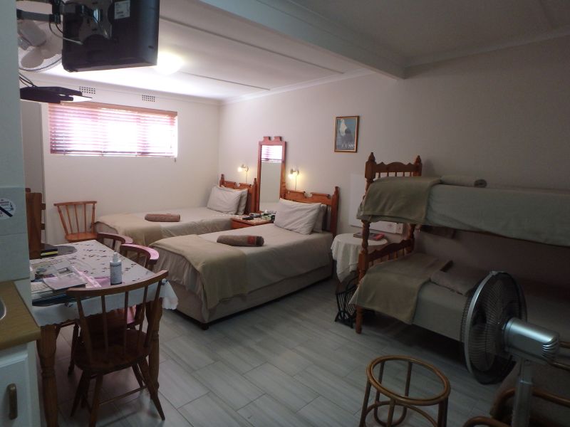 Two single beds and two normal size bunk beds with hospitality mattresses in one large room with bathroom en-suite with shower, kitchenette, fiber Internet / wifi, DSTV Hotel Bouquet, flat screen TV, fully self-contained .Own private entrance. Fans, heaters, electric blankets, hairdryers, clock radio/alarm, coffee/tea facility, swimming pool/braai for guests.