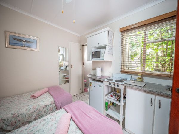 Two single beds with bathroom en-suite with shower, kitchenette, free wifi / internet uncapped, DSTV Hotel Bouquet,TV.,fully self-contained.Own private entrance. Fans,heaters,hairdryers,clock radio/alarm,coffee/tea facility,swimming pool/braai for guests.