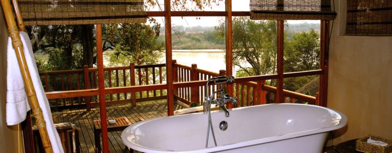Luxury room with en-suite bathroom. Overlooking the Okavango river. Bath, inside- and outside shower.