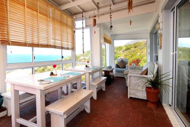 150m from sea. 6 en-suite sea facing rooms (can sleep 14) ideal for singles, couples, families or groups. Most rooms open onto the terrace with big sliding doors overlooking False Bay. Beautiful indigineous garden with abundance of birdlife. Peaceful area with nature reserve next door and the Swartberg-range behind us. 40 sq m patio (where outstanding breakfast can be enjoyed) with panoramic sea views. Whale watching from August to November over False Bay, looking across to Hottentots Holland Mountains and Cape Hangklip. Private entrances and owner managed. We speak English, Afrikaans and understand Dutch.