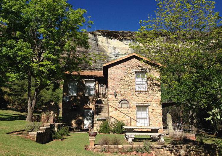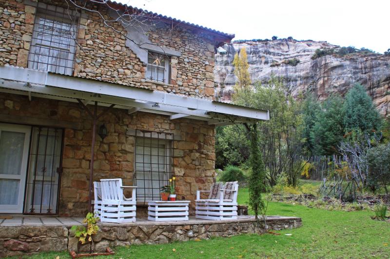 The cottage is built in country French style with the iconic Clarens sandstone. This luxury fully-equipped cottage sleeps 6 persons and comprises of 3 bedrooms, each with their own entrance. Downstairs are 2 bedrooms, 1 with a double bed and 1 with 2 three-quarter beds, both share a bathroom with a corner bath and shower. The upstairs room contains a king-size bed and en-suite bathroom with bath and shower. This is accessed by an external staircase.