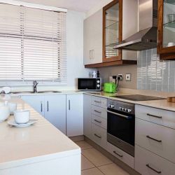 The kitchen is equipped for self-catering with a fridge-freezer, an electric oven and stove, a microwave, and an ice-maker. The open-plan living area includes a dining table and chairs, and a lounge with a TV with a full selection of DStv channels. Free uncapped Wi-Fi is available.