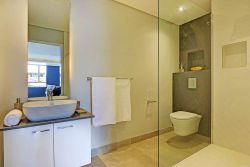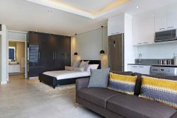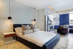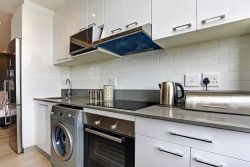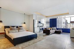 Idyllically situated in the Foreshore, this spectacularly renovated apartment has been designed and equipped to the highest of standards. The modern apartment is comparative to that of a luxury hotel suite of generous proportions. The stylish kitchen has a compliment of Caesarstone work surfaces with metro tile splash back, oven, hob, SMEG washing machine and large fridge freezer. The open plan living room has a L-shape couch, Samsung smart TV, Fiber internet, and feature bulkhead with up lighting as well as LED down lighting. The bedroom offers a Queen extra-length bed with a 5-star hotel standard mattress, feature pendant bedside lamps, and ample cupboard space behind sleek charcoal cupboards, as well as space to store your suitcases. The elegant bathroom has a large frameless glass shower, single vanity with floating sink and backlit mirror.