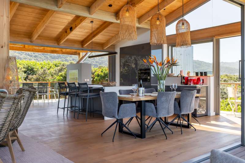 Set in the heart of Keurbooms’ natural beauty, is this stunning, newly renovated beach house. The spacious, light-filled upper level features open plan living areas, beautifully furnished in warm earthy tones and with large glass sliding doors that frame the breathtaking ocean view. The living, dining, and kitchen areas flow seamlessly together and open onto a large sea-facing patio, ideal for enjoying morning coffees or sundowners with a view of the ocean stretching all the way to Robberg Peninsula. A second patio at the back, overlooking the fynbos forest, includes a built-in braai for easy outdoor meals. Downstairs are three beautifully styled bedrooms, each with its own modern en-suite bathroom and access to a patio. Located in a secure beachfront estate with a communal pool, the home offers gorgeous first-row sea views and direct access to the soft, golden sands of Keurbooms Beach.